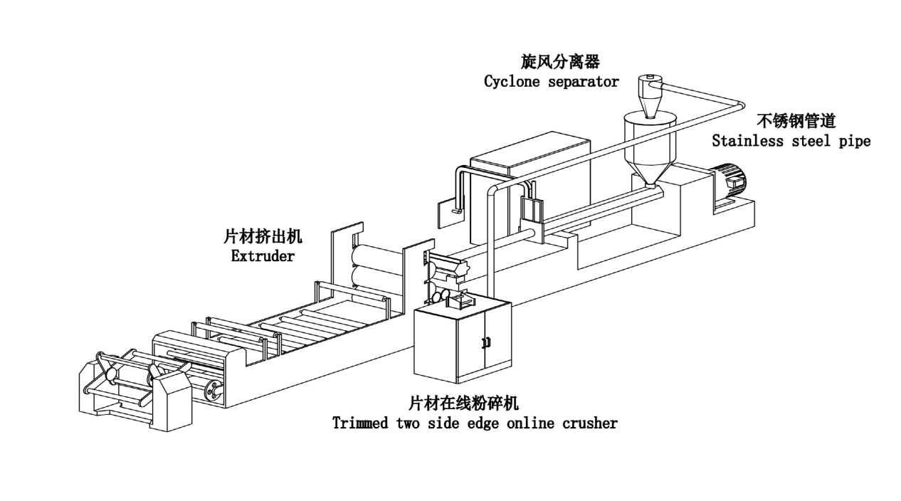 Sheet and Plate Extrusion:Efficient online recycling for PS, PP, PET sheet production lines, reducing waste and improving material utilization.